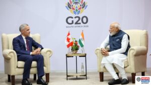 A high-resolution photograph of the Prime Ministers of Australia, India, and Canada standing on a podium with the G20 South Africa 2025 backdrop. The leaders are dressed in formal business suits and are seen engaging in a three-way handshake, smiling towards the camera. Behind them, the flags of Australia, India, and Canada are displayed prominently side-by-side, symbolizing the new strategic alliance in the Indo-Pacific region.