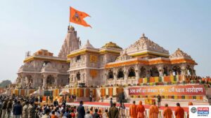 This image captures the fully constructed Ram Mandir in Ayodhya, heavily decorated with marigold garlands in preparation for the historic flag hoisting ceremony scheduled for November 25, 2025. Workers are visible near the 161-foot tall main Shikhar (spire) where a large saffron flag is already waving. In the foreground, a prominent banner in Hindi reads “500 वर्षों का संकल्प पूरा – धर्म ध्वज आरोहण” (Resolution of 500 years fulfilled – Hoisting of the Dharma Flag), marking the official completion of the temple construction. A crowd of devotees, security personnel, and sadhus are gathered in the temple precincts under a clear sky.
