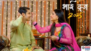 This informational graphic highlights the Hindu festival Bhai Dooj, which will be celebrated on October 23, 2025. The main focus of the image is to inform viewers about the “Shubh Muhurat” the auspicious timings for the Tilak ceremony.