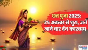 This beautifully crafted illustration perfectly represents Chhath Puja 2025’s four-day festival program starting from October 25. The image depicts a devoted woman in traditional purple and golden saree standing in sacred waters, holding a bamboo basket filled with ritual offerings including fruits, sugarcane, and traditional sweets. The golden sunset backdrop symbolizes the worship of Sun God during the complete four-day schedule: Nahay Khay (October 25), Kharna (October 26), Sandhya Arghya (October 27), and Usha Arghya (October 28). The floating diyas on water represent the spiritual essence of this ancient Hindu festival, while the serene water setting captures the traditional practice of offering prayers in rivers and ponds. This comprehensive visual guide helps devotees understand the complete Chhath Puja 2025 program, emphasizing the festival’s significance in Bihar, Jharkhand, and Uttar Pradesh. The text overlay clearly announces the October 25 starting date, making it an ideal visual reference for the four-day celebration dedicated to Surya Dev and Chhathi Maiya.