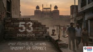 A conceptual journalistic illustration featuring a weathered brick wall in the foreground inscribed with the number ’53’, representing the death toll of the 2020 Delhi Riots. A rusted, heavy scale of justice sits on the wall, with a fist holding the scales. In the background, a hazy, sunset-lit silhouette of the Red Fort and Old Delhi streets looms, symbolizing the 5-year legal battle and the ongoing debate over justice versus revenge.