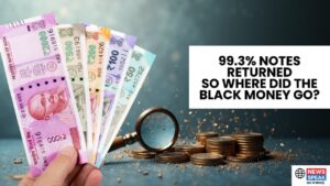 A hand on the left holds a fan of new Indian currency notes, including the 2000, 500, 200, 100, and 50 rupee bills. On the right, a magnifying glass rests on a dark surface, pointing towards stacks of coins. An overlaid white text box on the right side poses the question in all-caps: 99.3% NOTES RETURNED SO WHERE DID THE BLACK MONEY GO?