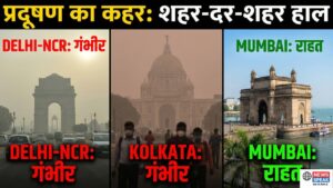 A three-panel split-screen graphic comparing air pollution levels across major Indian cities. The top banner features Hindi text that translates to “Pollution’s Havoc: City-by-City Status.” The left panel shows the India Gate in Delhi-NCR shrouded in heavy smog with red text reading “DELHI-NCR: गंभीर” (Serious). The middle panel depicts a smoggy Victoria Memorial in Kolkata with people wearing masks and red text reading “KOLKATA: गंभीर” (Serious). The right panel shows the Gateway of India in Mumbai under clear, sunny blue skies with green text reading “MUMBAI: राहत” (Relief).