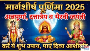 A vibrant and devotional feature image for Margashirsha Purnima 2025. The background displays a deep blue night sky with a large, glowing full moon. On the left, Lord Dattatreya is depicted with three heads, accompanied by a cow and four dogs. On the right, Goddess Annapurna is seated, holding a golden ladle and pot of food. The center features a fiery aura of Goddess Tripur Bhairavi above a lit oil lamp (Diya) and a floral puja thali. Bold Hindi text highlights the festival names and the promise of divine blessings through sacred remedies.