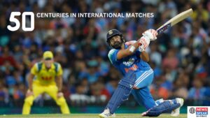 Rohit Sharma celebrating century milestone with raised bat at Sydney Cricket Ground during India vs Australia ODI match, crowd cheering in background, wearing blue Indian jersey, historic 50th international hundred achievement