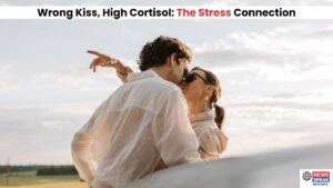 A feature image showing a man and a woman in a passionate embrace, kissing outdoors under a bright, cloudy sky. The woman, wearing sunglasses, has her arm around the man’s neck. The image has a text overlay at the top that reads, “Wrong Kiss, High Cortisol: The Stress Connection,” which frames the seemingly romantic act within the context of the article’s scientific topic.